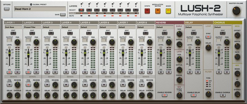 СинтезаторLush 2 позволяет вам достичь «неслыханного» уровня творчества - каждый слой работает как независимый синтезатор со своей собственной полифонией, параметрами, улучшенным арпеджио и выбором между 8 лучшими инсертными эффектами.